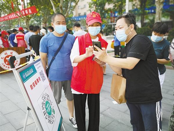 8月8日上午,周口市人民医院在五一文化广场开展核酸检测集中采样工作。在广场上,一群“红马甲”有的手持扩声器、有的帮忙测量体温、有的分发口罩,核酸检测采样现场秩序井然。③7