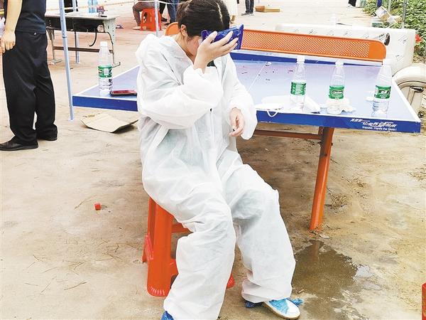 由于天气闷热,队员们穿上密不透风的防护服汗流浃背,汗水顺着他们的防护服、隔离衣往下淌,辛苦程度可想而知。