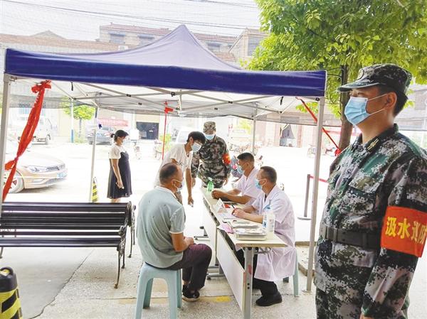 本报讯 “稍息、立正,汲水乡民兵应急排保证站好岗、服好务,守护群众生命安全和身体健康。”8月14日,郸城县汲水乡民兵应急排班长李艳杰,向该乡党委书记刘芳修报告疫情防控值勤情况。