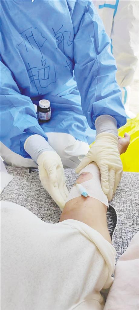 邢艳敏与孙永立严格按照要求操作,PICC管换敷贴正常时间是20到30分钟,由于患者家中条件简陋,且原来的敷贴粘的时间过长,造成分离困难,处理伤口时一直在用酒精和碘伏消毒,擦去皮肤上的污垢。最后,他们花费了50分钟才完成更换。此时,他们已穿戴防护服连续工作6个小时,身体严重脱水,头晕目眩。虽然很疲惫,但他们又投入到高风险人群咽拭子标本采集工作中。