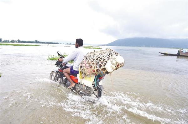 8月28日,在印度阿萨姆邦一个洪水泛滥的村庄,一名男子骑车涉水前行。