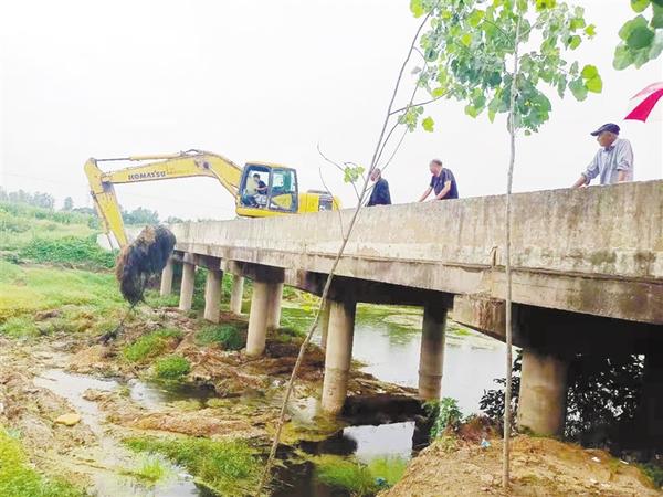 8月30日,在商水县巴村镇上城村北的汾河岸边,李振华和两位工友把挖掘机开到汾河附近,进行杂物清理(如图)。当清理到大桥下面时,桥上的挖掘机无法作业。李振华不顾秋水乍凉,把衣服一脱,跳入河中,把桥下杂物推到桥的两侧,直到桥下的杂物全部清理干净。当日,他们共打捞清理杂物7000余立方米,一度发黑的河水又恢复往日的清澈。