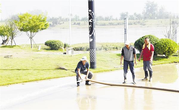 9月29日,沙颍河水位下降,沙颍河公园管理处组织干部职工,清理公园内的枯木、垃圾、淤泥等,并用高压水枪冲洗路面,进行全方位清淤清洁。②13 记者 孙安平 摄