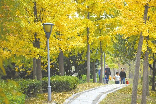 10月31日,周口公园的银杏树满树金黄、披金溢彩,在斑驳的绿树、红叶之间,格外美丽,吸引着周末休闲的市民来此观赏游玩。记者 梁照曾 摄