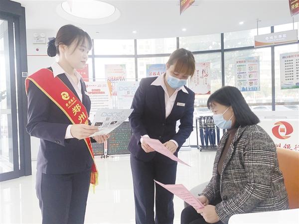 10月29日,郑州银行周口分行厅堂的工作人员为客户介绍理财业务。近日,该行加强疫情防控期间的金融服务保障,为客户提供精准度高、体验性好的服务。该行根据市场需求,及时推出理财产品,满足客户需求,用行动收获客户的满意率。记者 徐如景 摄