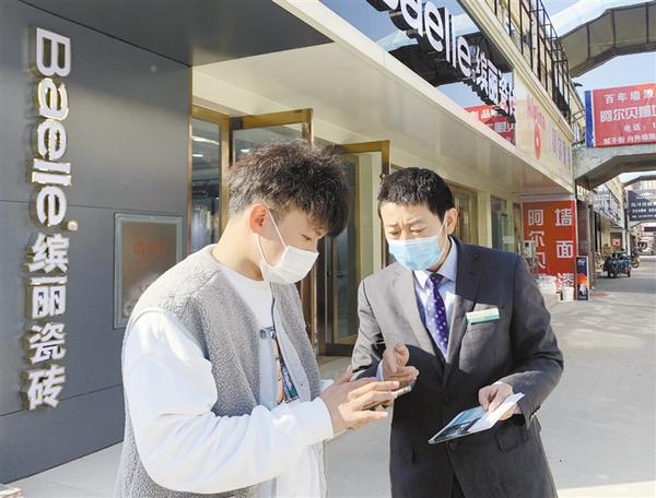 11月15日,农行周口分行火车站分理处工作人员在市区麒麟建材城缤丽瓷砖门店,指导客户通过农行掌银办理业务。近日,农行周口分行加强疫情防控期间金融服务保障,把掌上银行作为保障客户金融需求主渠道,为客户提供精准度高、体验性好的上门服务,点对点辅导客户特殊时期使用农行掌上银行自助办理业务,让客户足不出户就可完成转账、生活缴费等业务。 记者 徐如景 通讯员 冯振涛 摄