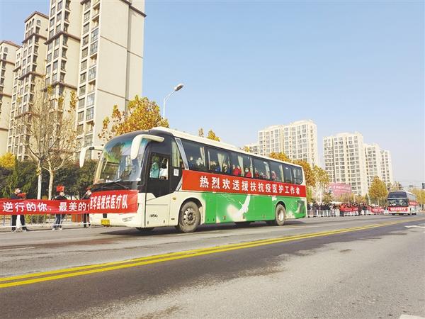 本报讯 人间有大爱,周口一家亲。11月26日上午,扶沟县在该县人民公园举行仪式,隆重欢送驰援扶沟新冠肺炎疫情防控的医疗队返程(如图),并向他们致以崇高敬意和最衷心的感谢。