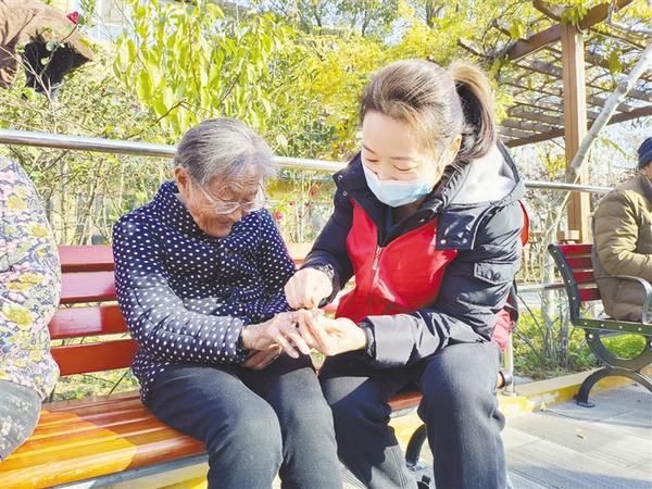 周口市三川社工义工服务中心志愿者为周口蓬莱养老院的老人修指甲。记者 窦娜 摄