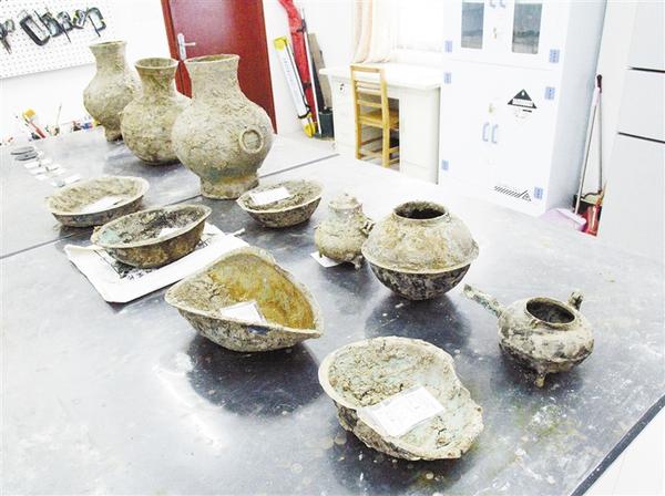 12月21日上午,平粮台遗址博物馆首次向外界展示最新的考古发掘成果。今年8月启动考古发掘以来,平粮台遗址清理出170多座古墓葬,出土器物千余件。清理出的古墓葬有战国时期的,也有汉唐时期的。出土的陪葬品有陶罐、铜器、铁剑、玉器、木漆器、铜镜等,很多器物做工精美。这些陪葬品不是寻常百姓所有,是贵族身份的象征,对研究淮阳区历史文化具有重要价值。目前,各项考古发掘工作还在进行。图为平粮台遗址出土的铜盆、铜壶等器物。②10记者 梁照曾 摄