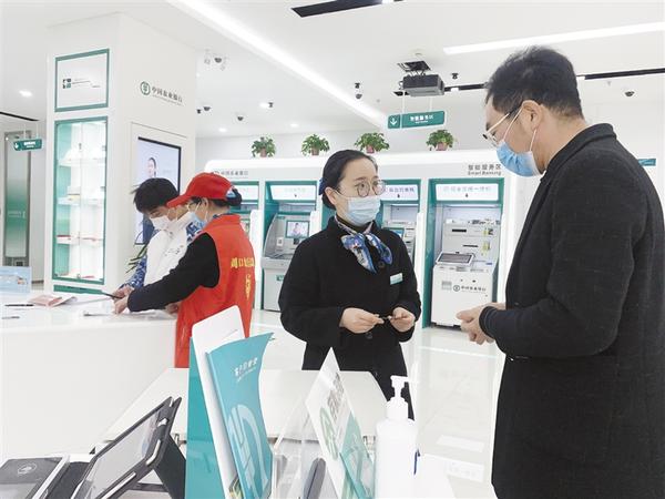 12月24日,农行周口分行营业部厅堂人员在为客户办理业务。近日,农行周口分行严格落实两级行机关每日两消杀、各营业网点每日三消杀,还为员工配备了口罩、消毒液等防护用品,并严格落实网点人员出入管理,要求所有进入网点的人员均佩戴口罩,体温检测,扫码登记,对现钞统一消毒后再对外投放,全力为社会公众提供“放心钱”“卫生钱”。
