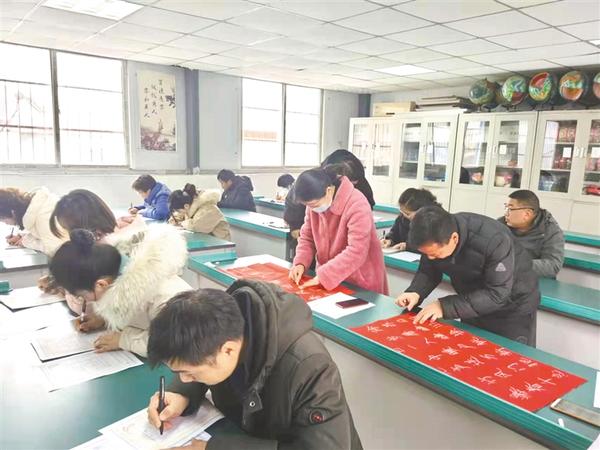 近日,周口李庄小学两个校区同步举行了庆元旦教师书法比赛。参与比赛的教师表示,将以立德树人为根本目标,把书写基本功用到教学中去,既教会学生规规矩矩写字,又要教会学生堂堂正正做人。 通讯员 陈惠玲 摄