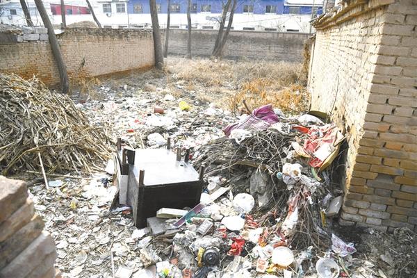 太康县朱口镇鑫源装饰门店楼后有陈年垃圾堆和杂物,未见整治迹象