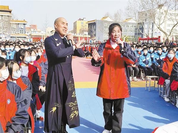 3月2日,省曲协副主席、中国曲艺牡丹奖获得者白军选与淮阳中学学生共同演唱戏曲名段《收姜维》。在“学雷锋日”即将到来之际,为弘扬和传承雷锋精神,把优秀的文艺作品奉献给人民,不断满足人民群众对美好生活的新期待,推动乡村振兴,当日,“文艺进万家 健康你我他”学雷锋文艺志愿慰问演出走进淮阳,范军、白军选等省曲艺名家登台献艺,为观众带来了一场精彩的文艺盛宴。记者 支亚茹 摄