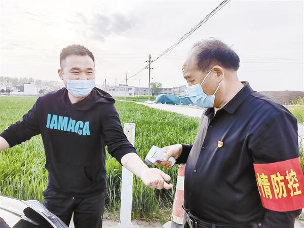 长条桌、测温枪、登记本、二维码、消毒液、应急帐篷……这些防疫工具构成了一个简易的卡点办公场所。4月9日下午6时许,虽太阳西斜,却依然明亮。63岁的周吉锋戴着红袖章站在市城乡一体化示范区搬口办事处毛寨行政村疫情防控监测卡点处,抬手示意外来车辆停车扫码、测温、填写场所码。“除了去区里、办事处开会,我每天都在这里守着,把好防输入、防输出的关口。”周吉锋说。