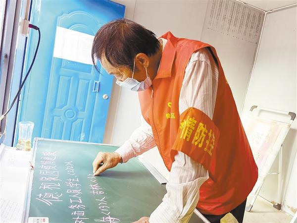 “刘师傅,中!吃完早饭就来,晚上9点后才走,每天坚守在卡点,你看黑板上的疫情通报就是他写的。”提起78岁的退伍老兵刘如意,示范区搬口办事处曾楼行政村支书曾凡和区信访维稳和法制工作办公室副主任马琳都赞不绝口。