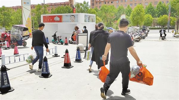 在万和城超市,工作人员正引导进店的居民自觉排队、佩戴口罩、测量体温和扫“周到办”场所码,严格按照防疫要求,陆续进入超市购物。“我们采取顾客分批次进入的方式,实时控制客流量。”在万和城值守的郸城县商务局督导人员表示。