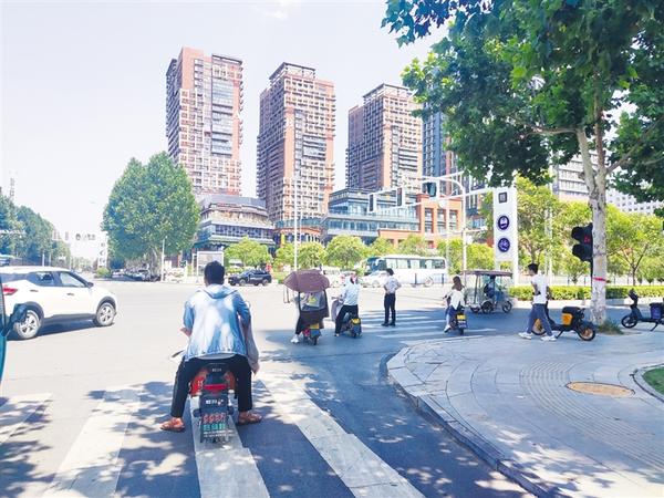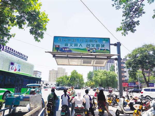 在工农路与黄河路交叉口,烈日当头,行人在遮阳棚下等红灯,遮阳棚上“走文明路、开文明车、做文明人、创文明城”的宣传标语格外醒目。