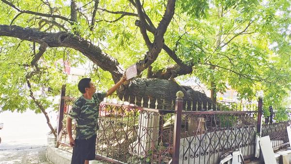 6月29日,在司老街村党支部副书记司兆力的引领下,记者见到了这棵千年国槐。该树被圈在一个栅栏里,厚土堆积根部,树身弯曲横生,整体向西南方向倾斜,半腰用柱石支撑,与地面约成45度角。近看树皮斑驳、老枝虬蟠,远看枝叶茂盛、亭亭如盖。