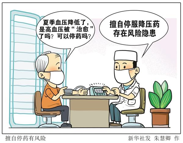 夏季天气炎热,很多高血压患者都会发现自己的血压降低,甚至回到了正常范围。这是否意味着高血压已“治愈”,可以停药?专家提示,擅自停服降压药存在风险隐患。新华社发 朱慧卿 作
