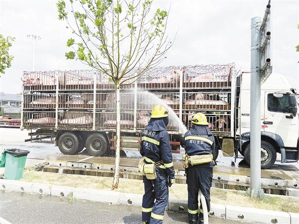 7月12日13时,由于天气炎热,一辆载有百余头活猪的货车行至S81商南高速时,车上的活猪出现中暑症状。接到报警后,商水县消防救援人员立即架设水枪给猪群降温。经过近20分钟持续降温,猪群的中暑现象得到有效缓解。②10