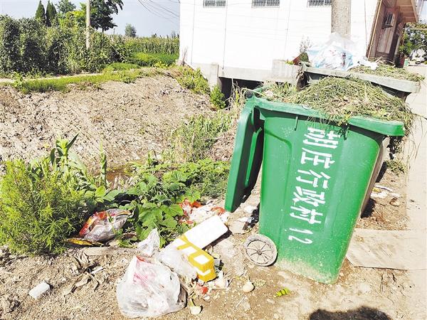 沈丘县莲池镇北童村境内多处垃圾桶溢满,旁边散落有生活垃圾,村北沟内有散落垃圾,边坡有陈年垃圾