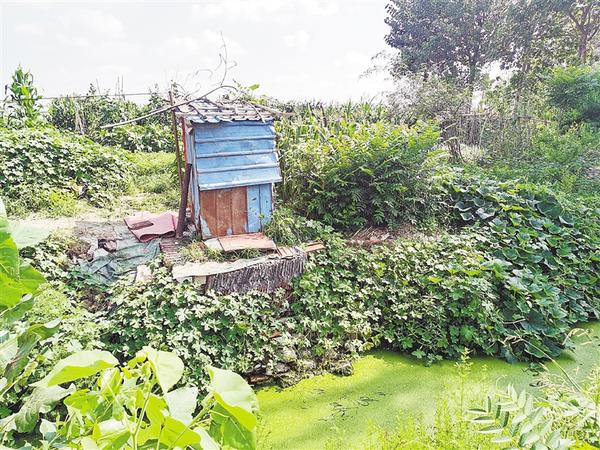 沈丘县槐店回族镇薛庄村内坑塘内有大量垃圾漂浮物,坑塘边有建筑垃圾和杂物,村内还有多个旱厕