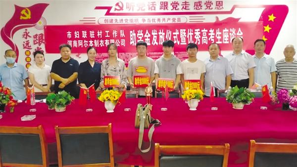 8月15日,4名品学兼优的高考生获得助学金。当日,市妇联携手河南阿尔本制衣有限公司,在市妇联帮扶村西华县叶埠口乡洼赵村举行助学金发放仪式暨优秀高考生座谈会,向4名优秀学子每人发放2000元助学金。
