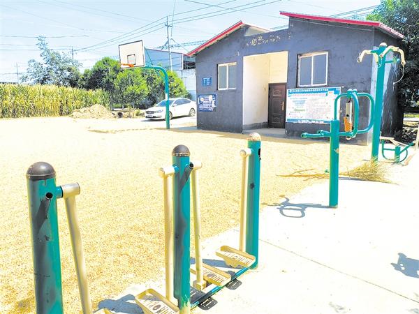 商水县张明乡东张明村文化大舞台广场上有晾晒的粮食,健身器材残缺不全,卫生间大门落锁