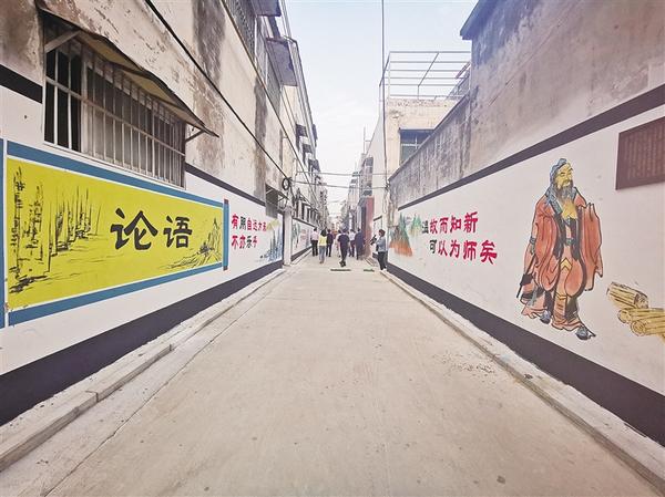 “建中社区‘创文’示范片区背街小巷错综复杂,不少墙体年久脱落,小广告屡屡反弹,环境脏乱差。”小桥街道办事处有关负责人介绍,为改变这种情况,他们组织人员集中清运垃圾14车,修补、硬化背街小巷、主次干道、小胡同45条约14000平方米,粉刷墙体3.8万平方米,增设宣传版面300处,绘制完成1200平方米的包括《论语》、“孝道文化”等内容的宣传墙,不仅消除了脏乱差、美化了环境,更成为居民耳闻目染新时代新风尚的一道风景。