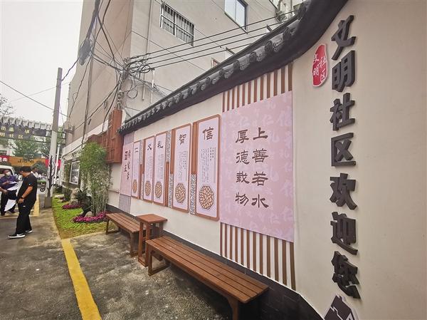 文明社区路面干净如洗,两侧建筑立面粉饰一新,就连电线杆也披上了“画衣”,加上古香古色的挑檐、雕窗,放眼望去街景美观大方。同时,还增设了休闲座椅、绿化景观和文化墙等元素,使环境更加优雅和舒适。