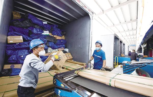 工人将分拣后的快递物品扫码装车送往省内各地