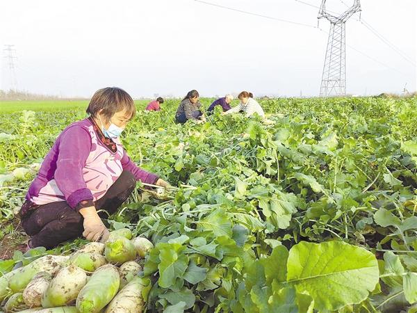 为应对新一轮寒潮天气,我市各蔬菜种植基地菜农忙着抢收露地蔬菜,避免蔬菜遭受冻害。图为12月13日,商水县阳城办事处旭泽农民种植专业合作社的菜农在抢收青萝卜。