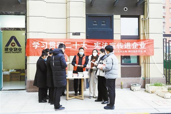 12月8日,市工商联联合市司法局、市法学会先后到周口市昌建创业商会、周口酒业商会、建业物业管理公司等地开展宪法宣传活动(如图),进一步增强企业职工的法治素养。