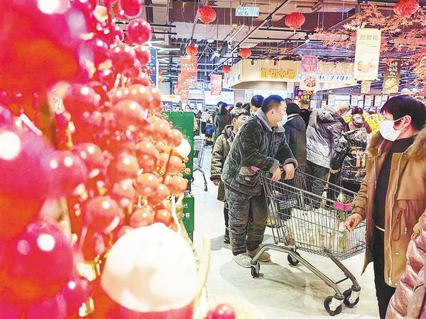 在华联生活超市,小广播里循环播放着《好运来》《财神到》。生鲜专柜区各种蔬菜水果琳琅满目,人们在不同的区域前精心挑选所需物品。正在挑选食用油的王女士告诉记者:“超市内货物充足,家里需要的基本都可以买到,很方便。”“现在物价总体平稳,许多农产品价格不贵,大家都放开了手脚买!”商店老板高兴地说。