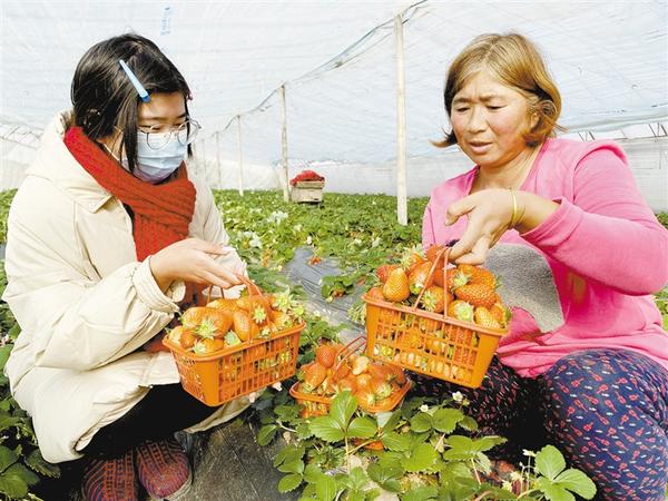 躬身进入大棚,只见一串串鲜红的草莓在白花绿叶中茁壮生长。不少游客挑选采摘着“红颜”“芒果”“贵妃天香”等优质草莓。大棚外,有的游客提着一篮篮刚采摘的草莓排队称重。大棚内外欢声笑语让人们感受到了浓浓的春意。