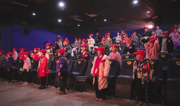 “怒发冲冠,凭栏处,潇潇雨歇……”影厅内,小记者肃然起立,集体朗诵古诗词《满江红》,随后,60名小记者逐一登台朗诵。澎湃激昂、热血沸腾的朗诵点燃了孩子们的报国热情。表现优秀的选手获得荣誉证书、奖品后,集体观看电影《满江红》。