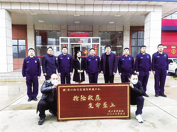 2月9日上午,周口骨科医院负责人把一面写有“抢险救危 生命至上”的牌匾送到周口经开区消防救援大队。