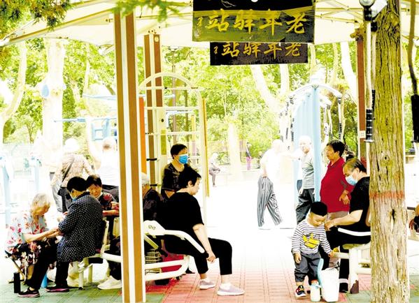 5月16日上午,老人们在七一中路的周口人民公园的“老年驿站”内休息娱乐。据了解,“老年驿站”等设施,是近年周口市中心城区建设中的街区配套便民服务元素,其不仅为居民休闲娱乐提供便利,也展示了现代城市越来越人性化的服务功能,更是我市文明城市创建的建设成果,提高了城市品格和水平。