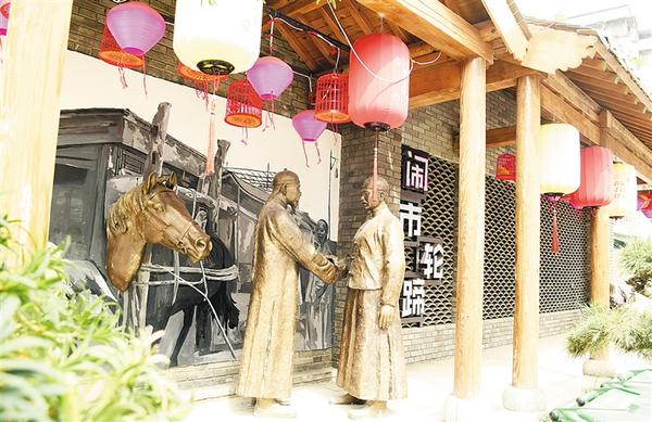5月16日上午,记者在荷花街看到,其沿街仿古式游廊又增添了“闹市轮蹄”雕塑,向人们再现了古街风情。地处周口市中心城区的荷花街是一条南北走向的古街,其最南段的古街叫牲口市街,是清代中原著名的骡马交易中心,成为当时周家口一景,被誉为“闹市轮蹄”。记者 梁照曾 摄