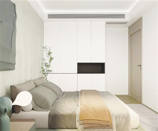 主卧床脚处定制通顶衣柜,增强储物功能;梳妆台嵌入其中,结合暖光照明提升空间层次与温和的感觉,主卧入口衣柜斜角设计,便于收纳展示避免视觉拥堵。