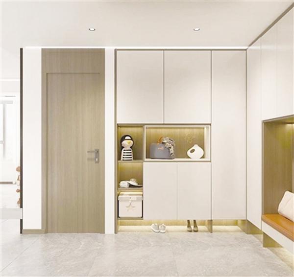 入户一侧设置通顶玄关柜,可以满足业主收纳需要,右侧打造一体式换鞋凳,嵌入灯带达到见光不见灯的效果,轻松营造归家氛围感。