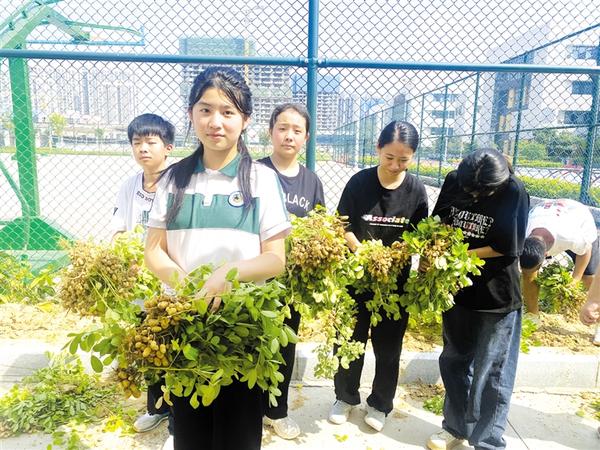 9月8日,周口市实验学校的学生们来到学校劳动实践基地收获成熟的花生。 阳光下,学生们体验到耕种辛苦的同时,也感受到了丰收的喜悦。 通讯员 李云 摄