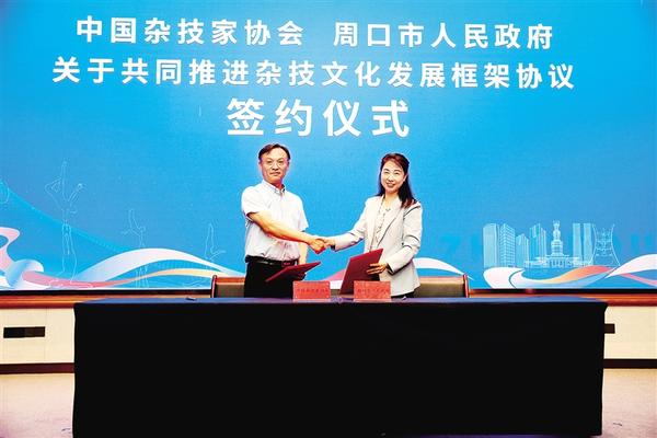 中国杂技家协会分党组成员、副秘书长刘挥,副市长刘颖分别代表中国杂技家协会、周口市人民政府签订《关于共同推进杂技文化发展框架协议》。