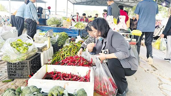 “漯河葡萄便宜了,10块钱3斤。”“茄子便宜了快来买啊!1块钱4斤。”“自己种的辣椒,2块钱1斤。”9月22日6时30分,川汇区汉阳路便民早市上人头攒动,流动商贩的叫卖声不绝于耳,他们拉着自家种的新鲜蔬菜来到这里售卖,经营肉食、干果调料及各类农产品的固定商贩也聚集于此。