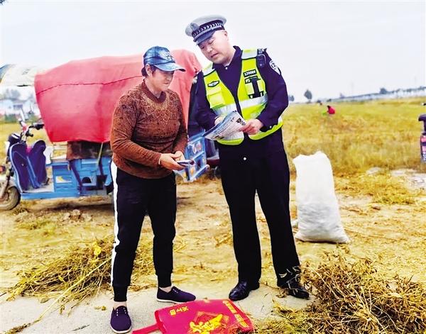 本报讯 当前正值秋收、秋种时节,一台台农用机械在田间穿梭,村民也驾驶着各种交通工具在田间辛勤劳作,农村地区道路交通十分繁忙。为持续推进农村地区交通安全大宣传集中行动,近日,郸城交警积极深入辖区田间地头,结合秋收时节农村道路的交通安全形势,采取多种措施,不断提升村民的文明交通意识,筑牢交通安全防线。