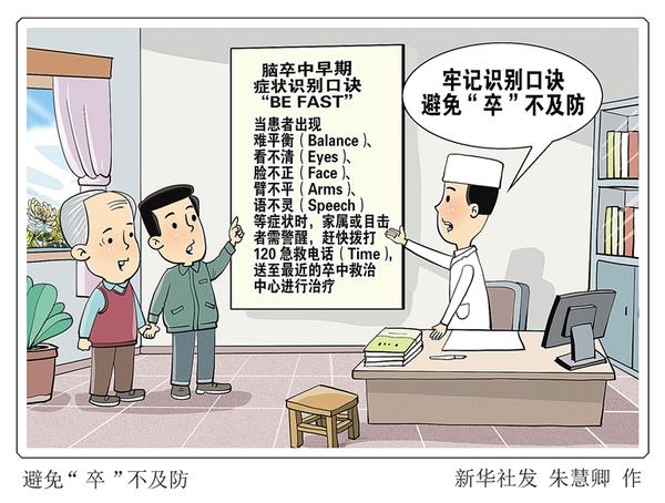 脑卒中又称“中风”,是一种急性脑血管疾病,具有发病率高、死亡率高、致残率高等特点。10月29日是“世界卒中日”,专家表示,预防脑卒中发生,一定要保持合理饮食、适当运动、戒烟限酒、心态平衡,同时要能准确识别脑卒中的征兆,积极应对。新华社发 朱慧卿 作