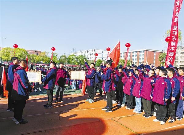 11月19日,周口市第一高级中学高三年级全体师生和家长齐聚操场,在这里隆重举行高考备考誓师大会,为1300多名高三学子备战高考鼓劲加油。图为同学们分别以班级为单位进行集体宣誓。 记者 刘华志 摄