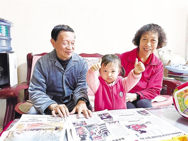 “现在我们的主要任务是照顾家里的孙女。孙女聪明伶俐、娇憨可爱。每当《周口晚报》送到家中,孙女总会喊着‘我要跟爷爷一起看报’,还十分热情地帮我翻报纸呢。”许登科说,孙女许诺虽然才2岁多,却对读书看报已经产生了浓厚的兴趣。每天戴着老花镜看报纸的许登科都会挑选一些文章念给许诺听,这也成了祖孙两人快乐的专属时光。当记者拍照时,许诺坐在爷爷奶奶中间竖起了大拇指,开心地喊着:“《周口晚报》真棒!”