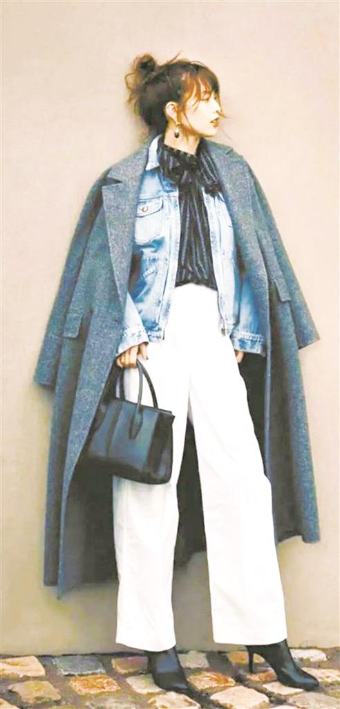 虽然相同材质的服饰会让整体造型看起来比较和谐,但不同材质的服饰会使造型更加张弛有度,还能有效避免因服装材质过于相似而导致的累赘感。特别是在“外套+外套”的穿搭中,不同材质、不同硬挺度、不同色彩的外套会碰撞出独特的造型层次感和时髦感。
