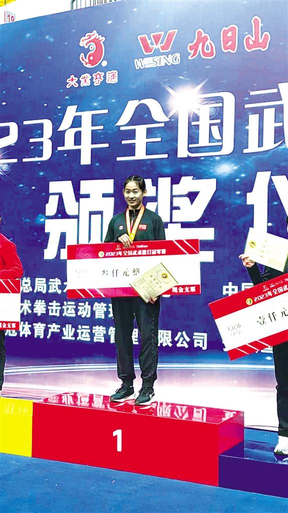 周口姑娘贾铭在颁奖台上。12月22日上午,由国家体育总局武术管理中心和中国武术协会主办的2023年全国武术散打冠军赛在安徽省蚌埠市落幕,来自全国41支代表队的365名散打运动员参与较量,周口姑娘贾铭夺取女子52公斤级冠军。